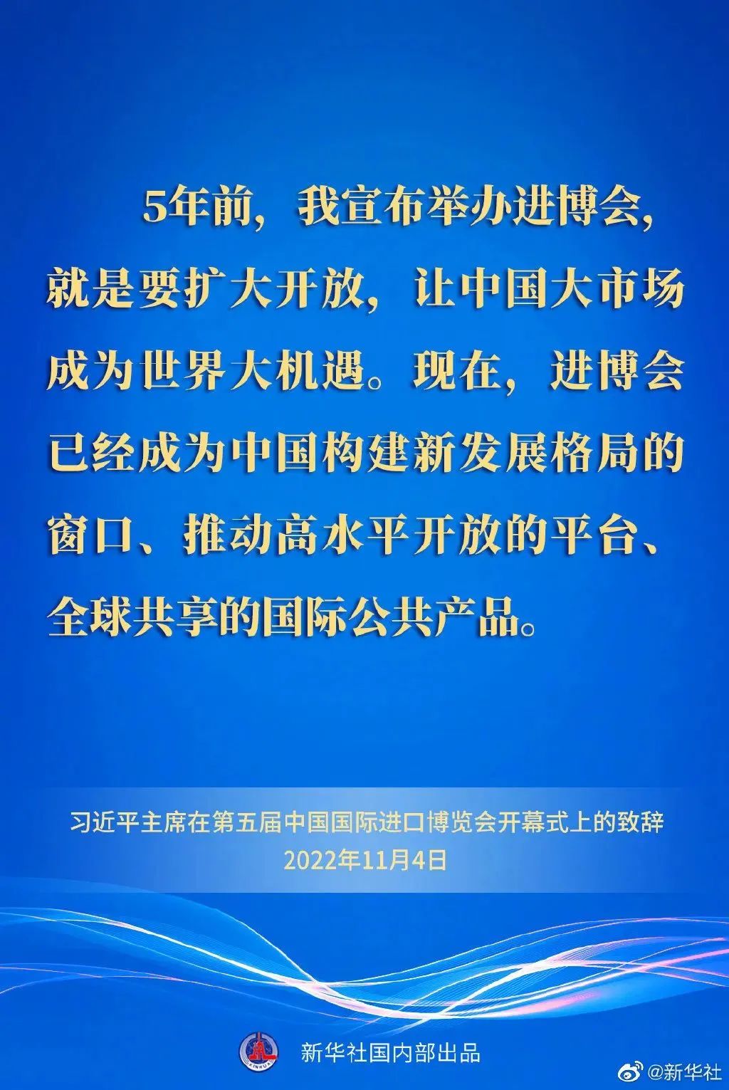 習近平指出,5年前,我宣布舉辦進博會,就是要擴大開放,讓中國大市場成為世界大機遇。現在,進博會已經成為中國構建新發展格局的窗口、推動高水平開放的平臺、全球共享的國際公共產品。