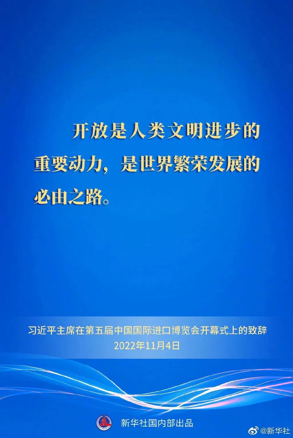 11月4日晚,國家主席習近平以視頻方式出席在上海舉行的第五屆中國國際進口博覽會開幕式并發表題為《共創開放繁榮的美好未來》的致辭。