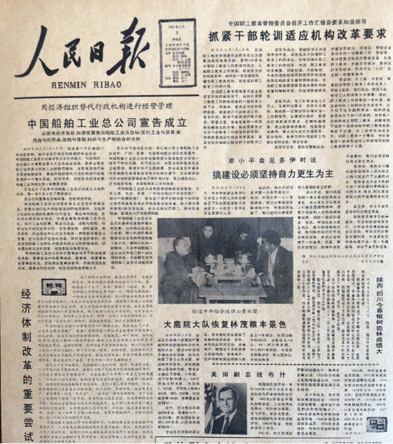 “改革開放是決定當代中國命運的關鍵一招?!?982年5月7日《人民日報》頭版刊載文章:“用經濟組織替代行政機構進行經營管理——中國船舶工業總公司宣布成立”,標題下文又著重強調“以提高經濟效益,加速我國船舶工業為目標,實行工業與貿易,軍用品與民用品,造船與修船,科研與生產相結合的方針”。頭版還發表了以“經濟體制改革的重要嘗試”為標題的“社論”。在這期《人民日報》的頭版還刊發了鄧小平同志接待外賓時的講話“搞建設,必須堅持自力更生為主”。