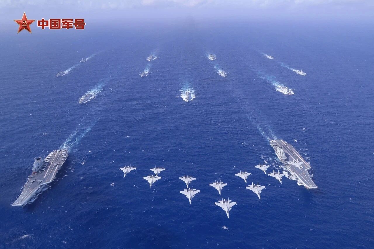 2024年10月,遼寧艦、山東艦編隊(duì)首次開展雙航母編隊(duì)演練。殲-15戰(zhàn)機(jī)組成楔形編隊(duì)飛過雙航母編隊(duì)上空。