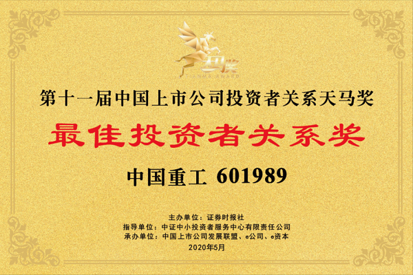 ????中國船舶集團旗下中國重工于近日榮獲由證券時報社主辦的“第11屆中國上市公司投資者關(guān)系天馬獎——最佳投資者關(guān)系獎”,滬深兩市共有100家上市公司獲得該獎項。