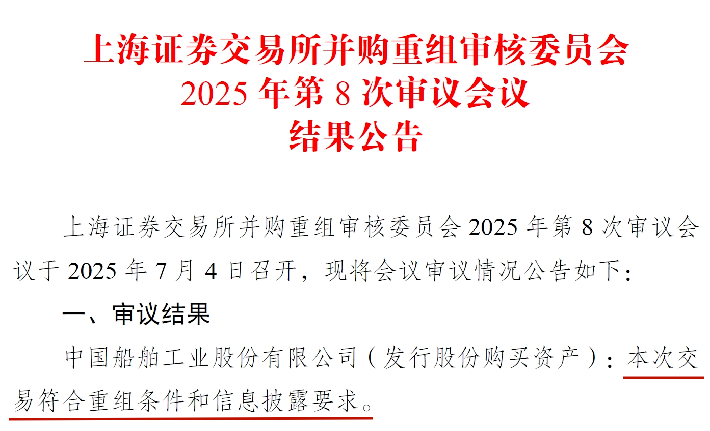 7月4日,上海證券交易所并購(gòu)重組審核委員會(huì)2025年第8次審議會(huì)議召開(kāi),審議結(jié)果為中國(guó)船舶工業(yè)股份有限公司(發(fā)行股份購(gòu)買(mǎi)資產(chǎn)):本次交易符合重組條件和信息披露要求。