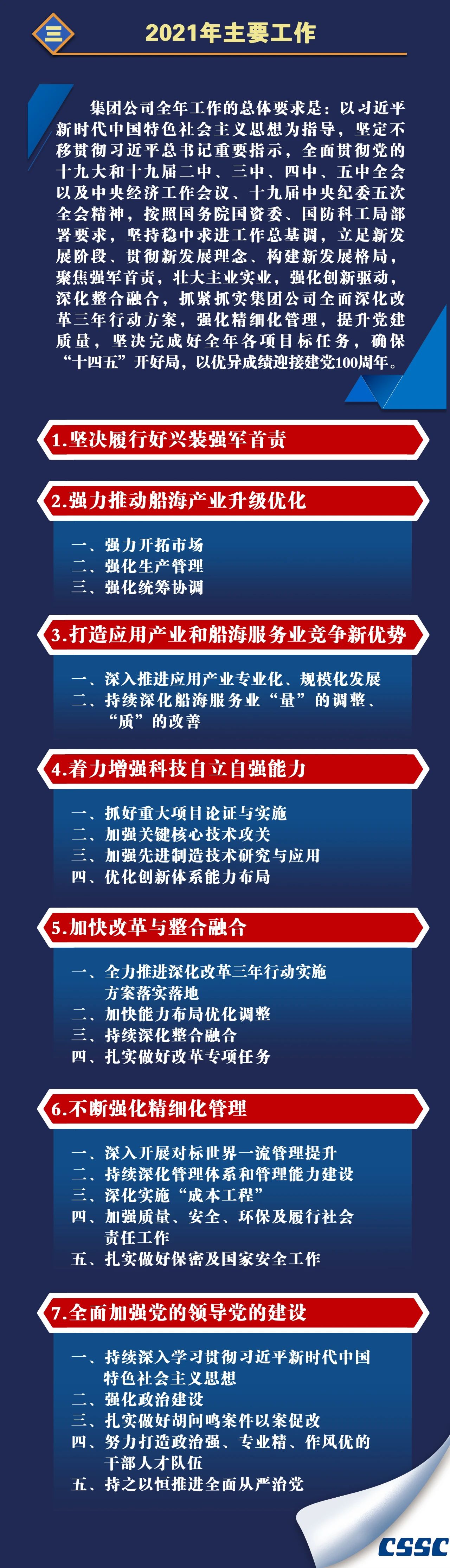 1月27日,在中國船舶集團有限公司2021年度工作會議上,中國船舶集團黨組書記、董事長雷凡培作了題為《貫徹新發展理念 強化精細化管理 為加快建設世界一流船舶集團不懈奮斗》的工作報告。