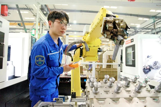 在總裝車間,TA替代人工為風電機組的偏航軸承擰緊螺栓。一百多顆螺栓,兩個人花上2個多小時才能擰完,TA只需40分鐘。TA可用激光識別、校準每一枚螺栓的位置,而且擰緊每一顆螺栓的力度都有記錄可查,真正實現了全自動、無人化的操作,且產品質量得到了充分保證。