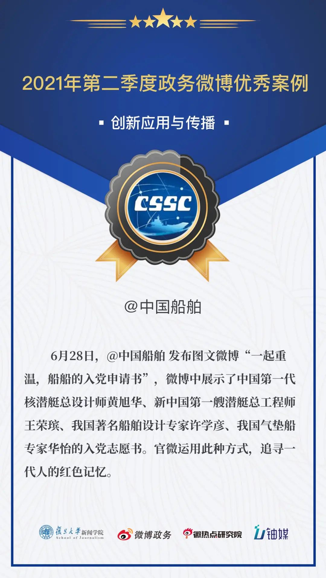 在幾百個(gè)微博政務(wù)賬號(hào)、幾千個(gè)微博政務(wù)優(yōu)秀案例的評(píng)選中,@中國(guó)船舶 憑借圖文微博“一起重溫,船船的入黨申請(qǐng)書”,再一次拿下“創(chuàng)新應(yīng)用與傳播”的獎(jiǎng)勵(lì),真的是太棒了!
