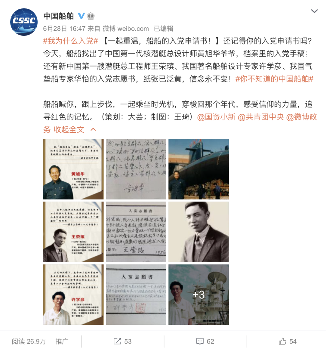 這篇微博展示了中國(guó)第一代核潛艇總設(shè)計(jì)師黃旭華、新中國(guó)第一艘潛艇總工程師王榮瑸、我國(guó)著名船舶設(shè)計(jì)專家許學(xué)彥、我國(guó)氣墊船專家華怡的親筆入黨志愿書,用一種時(shí)空穿越的方式,追尋一代人的紅色記憶,用船舶人的方式,慶祝建黨百年。