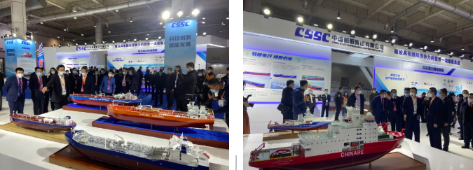 在創新船海裝備展區,中國船舶集團集中展示了清潔能源船舶、系列LNG船、系列集裝箱船、系列油船、系列散貨船、系列科考船、系列特種船和未來船舶八個板塊。