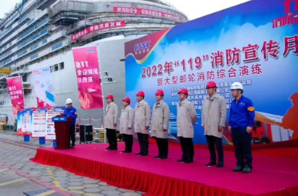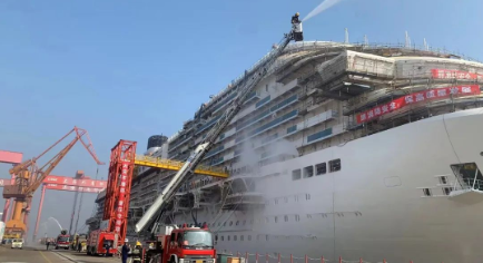 船舶建造過程中動火作業(yè)多、交叉作業(yè)多、有限空間多,消防安全一直以來都是企業(yè)安全生產(chǎn)工作的重點。本次演練選取大型郵輪作為演練對象,情景模擬船上發(fā)現(xiàn)火情后,外高橋造船以及聯(lián)合演練單位的消防隊伍實施協(xié)同救援,包括初期火情應(yīng)對、應(yīng)急報告、船上人員疏散、被困人員搜救、滅火等內(nèi)容,檢驗了企業(yè)應(yīng)對突發(fā)火情的快速反應(yīng)能力和協(xié)同作戰(zhàn)能力。