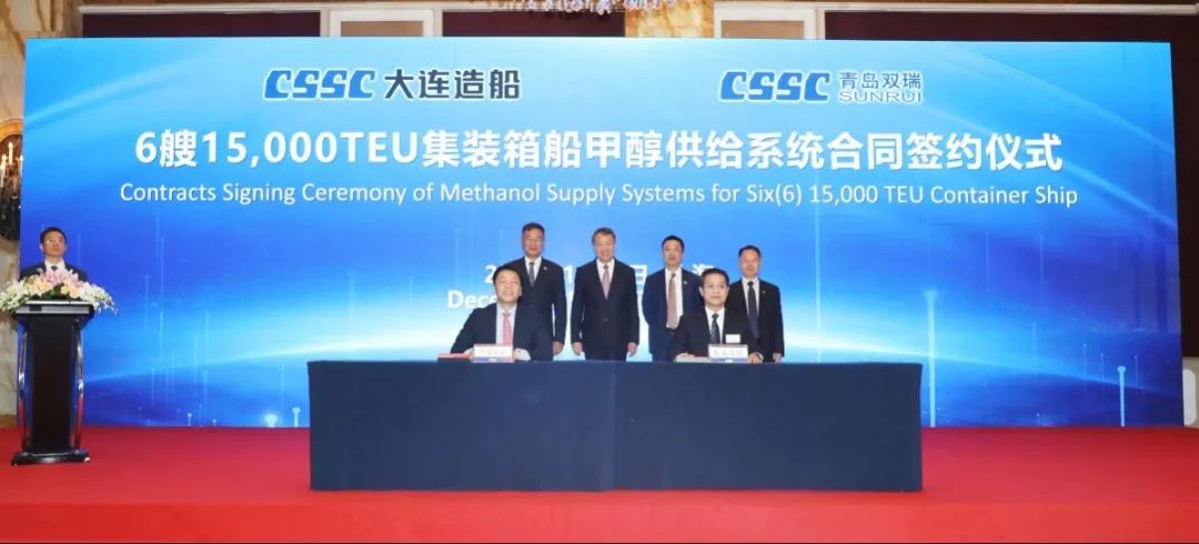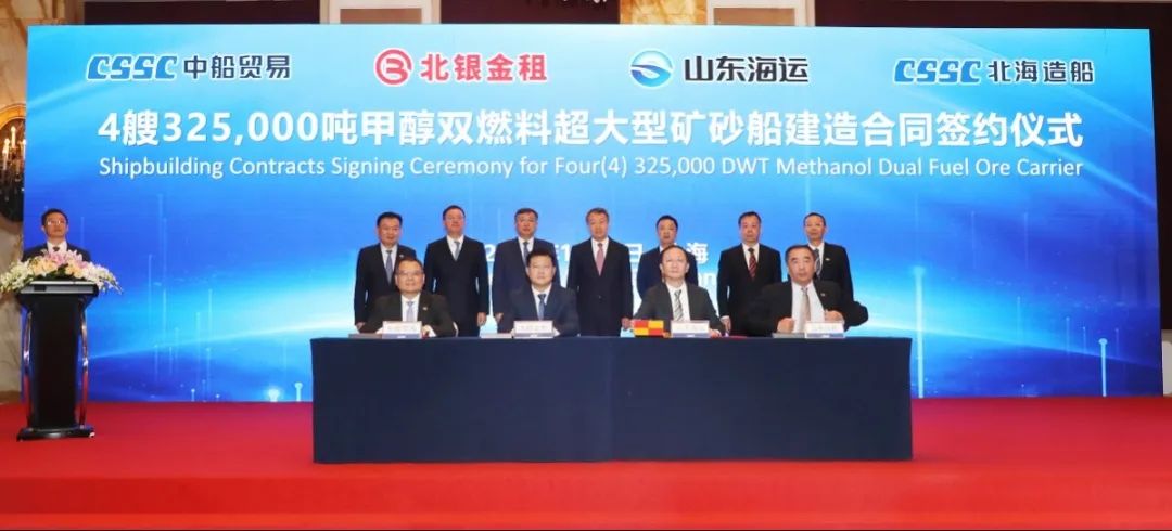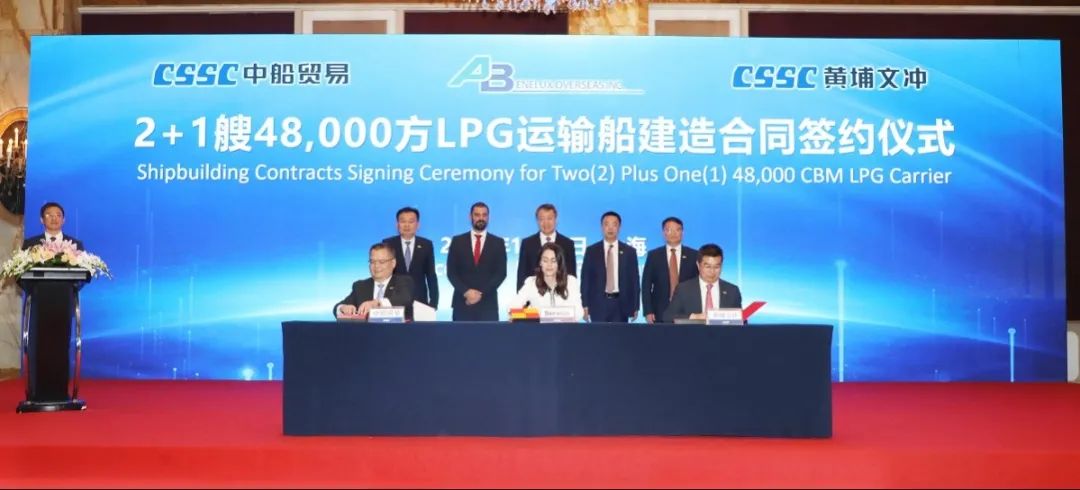 簽約儀式上,外高橋造船、中船貿易與Seaspan、現代Glovis簽署了6+4艘10800車LNG雙燃料PCTC船項目;廣船國際、中船貿易與HMM、現代Glovis簽署了6+4艘10800車LNG雙燃料PCTC船項目;北海造船、中船貿易與北銀金租、山東海運簽署了4艘325000噸超?型甲醇雙燃料礦砂船項目;江南造船、中船貿易與太平洋氣體簽署了3艘99000方VLEC船項目;黃埔文沖、中船貿易與Benelux公司簽署了2+1艘48000方LPG船項目;中船澄西、中船貿易與工銀金租簽署了4艘82600噸散貨船項目;大連造船與七二五所青島雙瑞簽署了15000TEU集裝箱船甲醇供應系統項目。