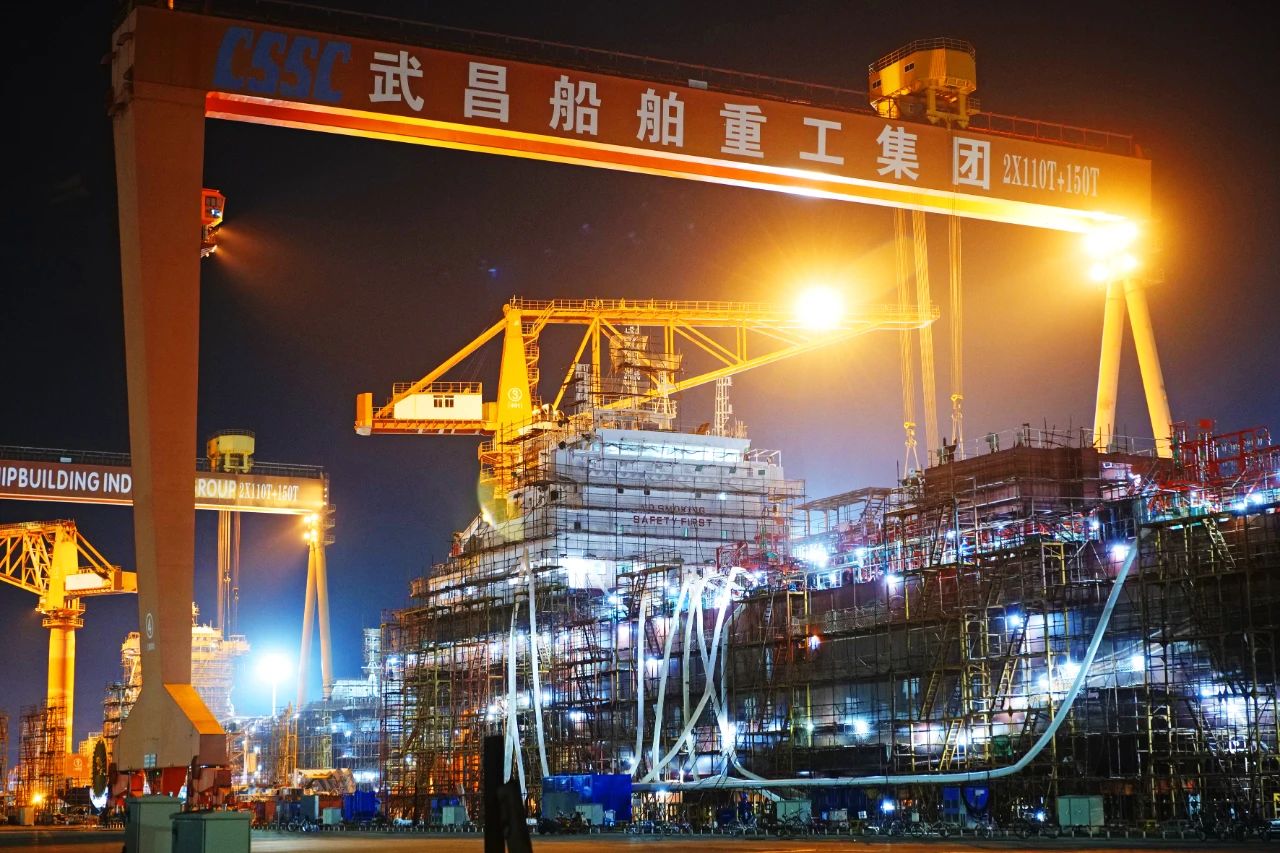 照片攝于國(guó)產(chǎn)首艘大型郵輪首次出塢前夕,拍攝時(shí)期為傍晚,船塢開啟燈光照明,工人在對(duì)船身做最后的涂裝修飾工作。這樣的角度觀看國(guó)產(chǎn)首艘大型郵輪令人無比震撼。