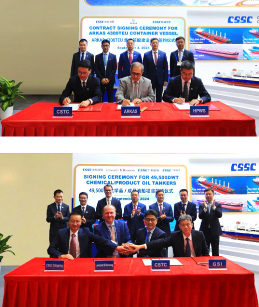 此次展會上,集團公司有關成員單位負責人率隊赴展會開展重點船海項目經營洽談并拜訪當地和周邊國家主要客戶。集團公司以“高端綠色、領跑未來”為參展主題,展臺設置了集團總體區、高端綠色船舶區、先進動力配套區共3個展示區域,重點展示了首艘國產大型郵輪、27.1萬立方米超大型LNG(液化天然氣)運輸船、10800車LNG雙燃料汽車運輸船、全球首艘LNG雙燃料VLCC(超大型油船)、21萬噸氨燃料散貨船、9.3萬立方米超大型全冷式液化氣船等一系列技術含量高、全球競爭力強的高端綠色船型,以及CPGC-WinGD 10X92DF-M甲醇雙燃料發動機、船用供氣系統、船用碳捕捉系統、船舶新能源動力系統解決方案等滿足IMO(國際海事組織)當前和未來排放要求的先進動力配套設備,充分彰顯了中國船舶集團的國際化品牌形象及引領國際船舶市場創新發展的澎湃動力。