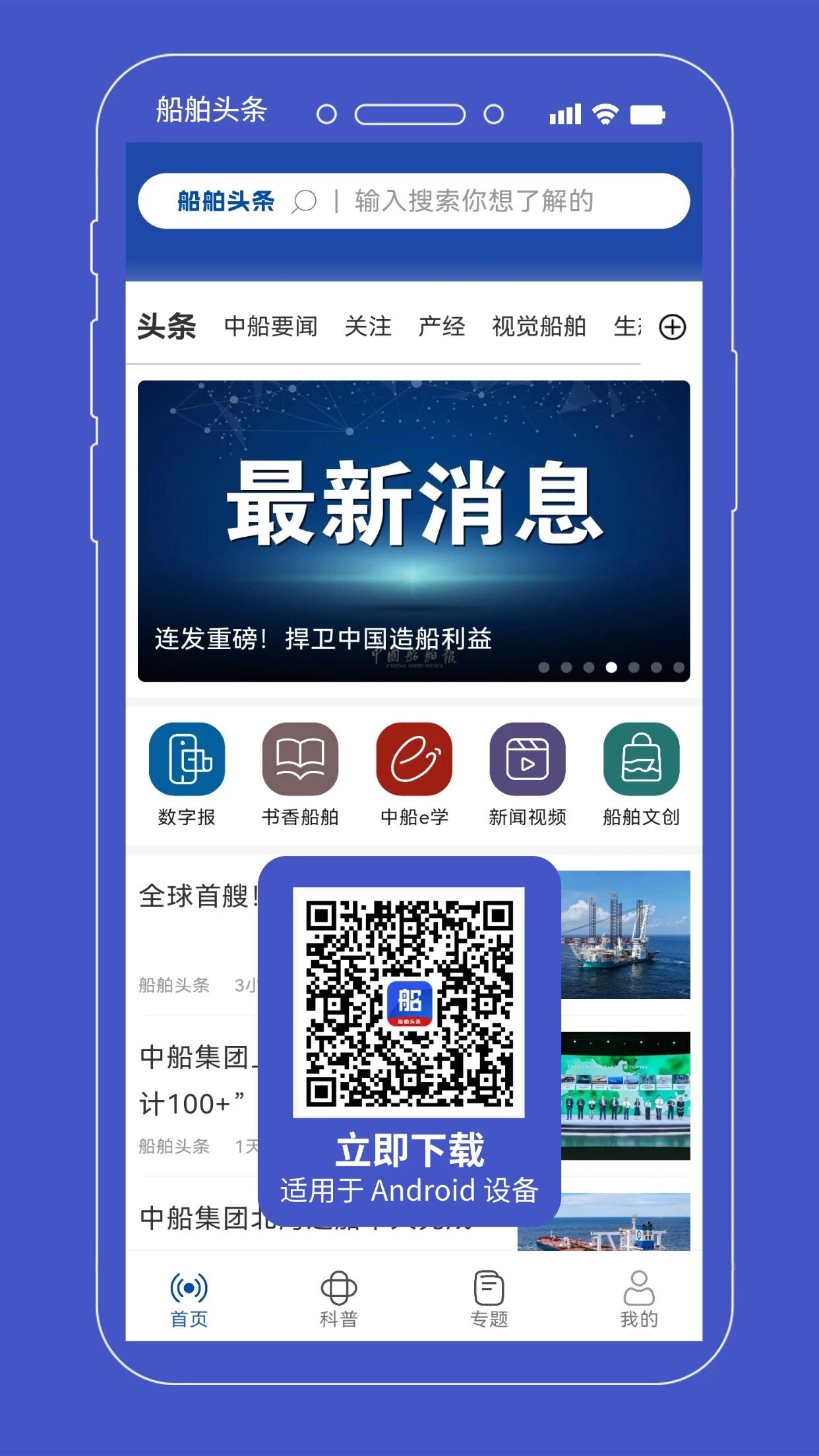 “船舶頭條”App聚焦海洋裝備產(chǎn)業(yè)鏈,集新聞發(fā)布、融合傳播、專業(yè)解讀、科普宣傳、企業(yè)智庫、服務(wù)聚合等功能為一體,設(shè)有“頭條”“中船要聞”“關(guān)注”“產(chǎn)經(jīng)”“視覺船舶”“生態(tài)圈”6個精品頻道以及“科普”“專題”等功能版塊,并鏈接“書香船舶”“《中國船舶報》數(shù)字報”“中船e學”“新聞視頻”“船舶文創(chuàng)”等多個服務(wù)端口,目前支持安卓系統(tǒng)下載使用。