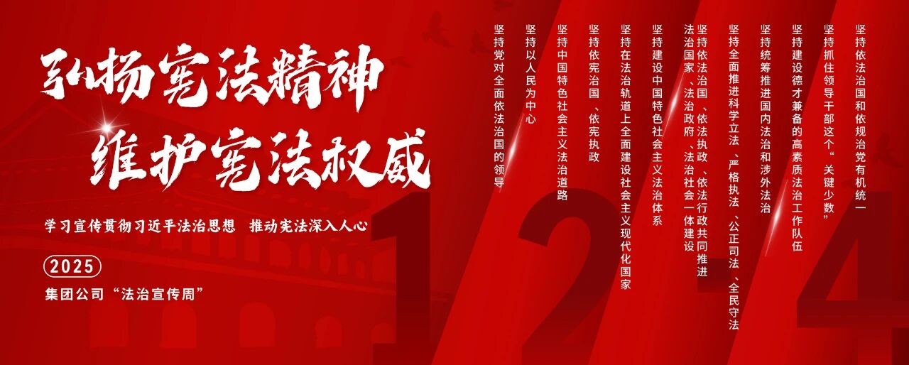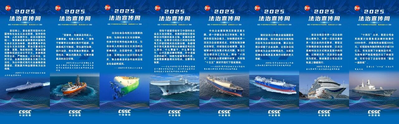 今年12月4日是第十二個國家憲法日。中國船舶集團有限公司深入貫徹落實中央宣傳部、司法部、全國普法辦《2025年全國“憲法宣傳周”工作方案》部署要求,以“學(xué)習(xí)宣傳貫徹習(xí)近平法治思想,推動憲法深入人心”為主題,精心組織開展2025年法治宣傳周系列活動。活動將學(xué)習(xí)貫徹習(xí)近平法治思想、習(xí)近平文化思想及憲法精神,與法治央企建設(shè)要求以及集團“懸規(guī)植矩 循序善治”特色法治文化深度融合,為加快建設(shè)世界一流船舶集團厚植法治土壤、注入強勁法治動能。
