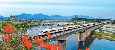 4月14日,一列動車穿行中國最美高鐵合福線新安江休寧古城巖大橋。徐 明攝(人民視覺)