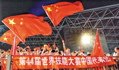 圖為日前在阿拉伯聯(lián)合酋長國舉行的第44屆世界技能大賽開幕式上,人們揮舞著中國國旗歡迎中國代表團入場。