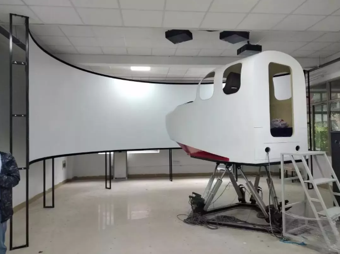 ????該平臺主要由地效翼船駕駛艙、六自由度運動平臺、工控機、激光高清工程投影機、180°金屬環形硬幕、圖像處理器、飛行仿真軟件等組成。駕駛座艙1:1復制交通運輸部指定的唯一教具——翔州1型地效翼船,在環境上保持了與真實地效翼船的高度一致,180°金屬環形硬幕最大程度再現全球各大水域的真實場景,而六自由度運動平臺真實實現了地效翼船升沉、俯仰、滾轉等動作,給學員身臨其境的地效翼船駕控感受。