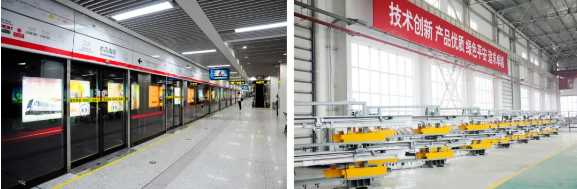 左圖:鄭州地鐵1號線使用七一三所軌道交通站臺門系統;右圖:七一三所軌道交通站臺門門機系統生產現場