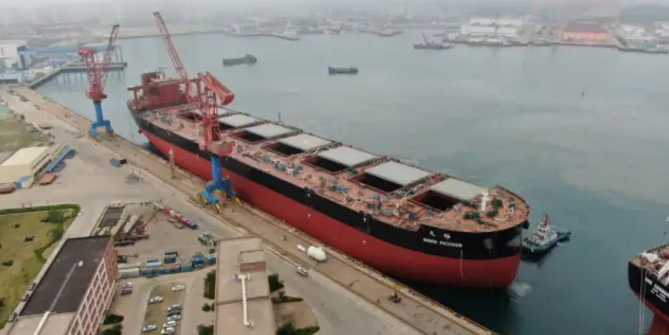 ????6月6日上午,外高橋造船為山東海運(yùn)建造的18萬噸散貨船H1494船順利出塢。