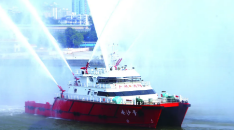2010年12月28日,廣船國際為南沙區建造的“南沙號”消防船投入使用?!澳仙程枴毕来傞L46米,型寬15米,排水量達到680噸,航速可達32.4公里/小時,共設置有6門水炮。其中,2門主炮射程可達到150米,4門副炮射程可達到130米;還設置了全船水幕保護系統,在火災現場可有效保護自身安全。“南沙號”消防船是當時國內最大雙體專勤消防船,大大增強了對船舶火災、石化碼頭、油庫火災的撲救能力。