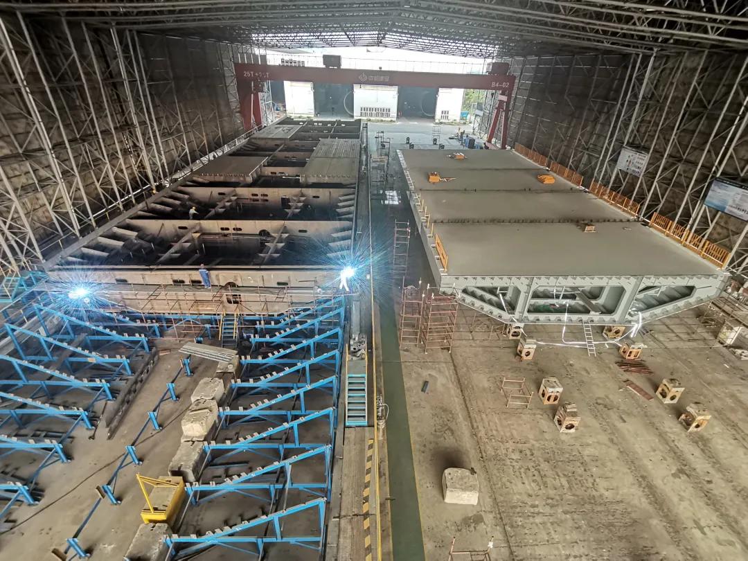 同樣承擔(dān)了深中通道隧道沉管鋼殼制造任務(wù)的中國船舶集團(tuán)旗下廣船國際,近日剛剛完成了E15管節(jié)鋼殼的過駁交付。E16鋼殼計(jì)劃在9月底前進(jìn)行聯(lián)合驗(yàn)收;E17鋼殼則正在進(jìn)行大節(jié)段總組。