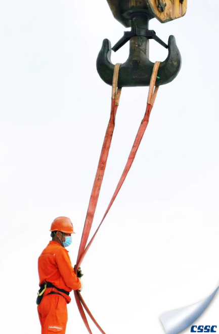 一名船舶起重工正在準(zhǔn)備起吊直徑10米、重約5噸的玻璃鋼材質(zhì)頂部圓盤至船舶上安裝,正值“梅花”過(guò)境后的陰雨天氣,身穿橙色工作服的船舶起重工在橙色吊帶、玻璃鋼材質(zhì)圓盤以及灰色天空下,構(gòu)筑了一幅簡(jiǎn)約而又濃墨重彩的線條與內(nèi)容相輔相成,彰顯了船舶工業(yè)之美、勞動(dòng)光榮之美。