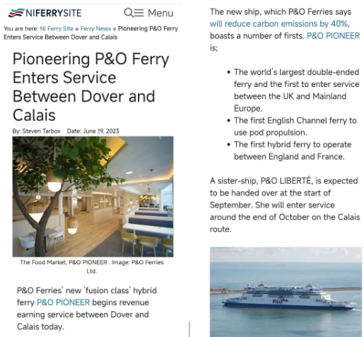 據介紹,“P&O Pioneer”的姊妹船已經基本達到完工狀態,預計將于9月初移交,10月底在加萊航線上投入使用。