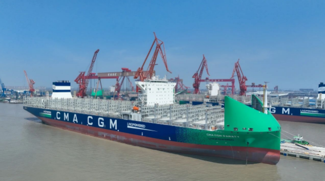 4月9日,中國船舶集團旗下七〇八所設(shè)計、滬東中華聯(lián)合中船貿(mào)易建造的新款清潔能源“海上綠巨人”13000TEU液化天然氣(LNG)雙燃料動力大型集裝箱船“CMA?CGM PARATY”號命名交付。