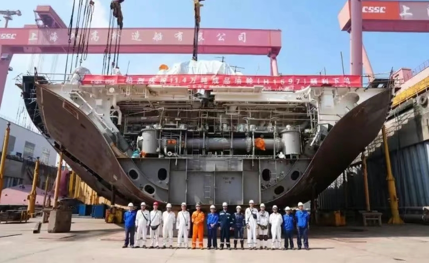 8月4日,為希臘Performance Shipping公司建造的11.4萬噸成品油船順利下塢。該船建造期間,外高橋造船項目團隊以分總段完整性下塢為目標,緊扣“三取消、四清零、工序前移”管理手段開啟總組工作。截至下塢,該船艉半船分段完工率實現(xiàn)100%。