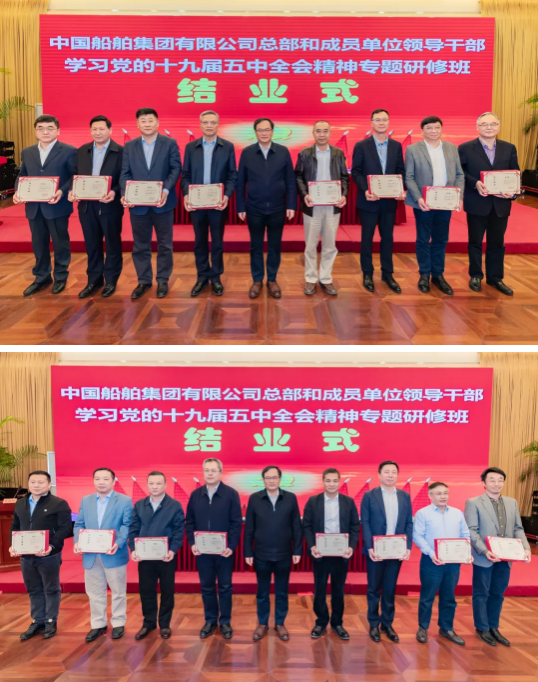 4月23日,中國船舶集團有限公司總部和成員單位領導干部學習黨的十九屆五中全會精神和黨史學習教育專題研修班圓滿結業。培訓期間,中國船舶集團黨組書記、董事長雷凡培以《深入貫徹落實習近平總書記重要指示批示精神 努力加快建設世界一流船舶集團》為題給全體學員們講授了第一課,中國船舶集團黨組副書記、總經理楊金成,黨組成員、副總經理孫偉、盛紀綱以及相關部門負責人先后出席各期結業式并聽取了學員們的學習匯報。