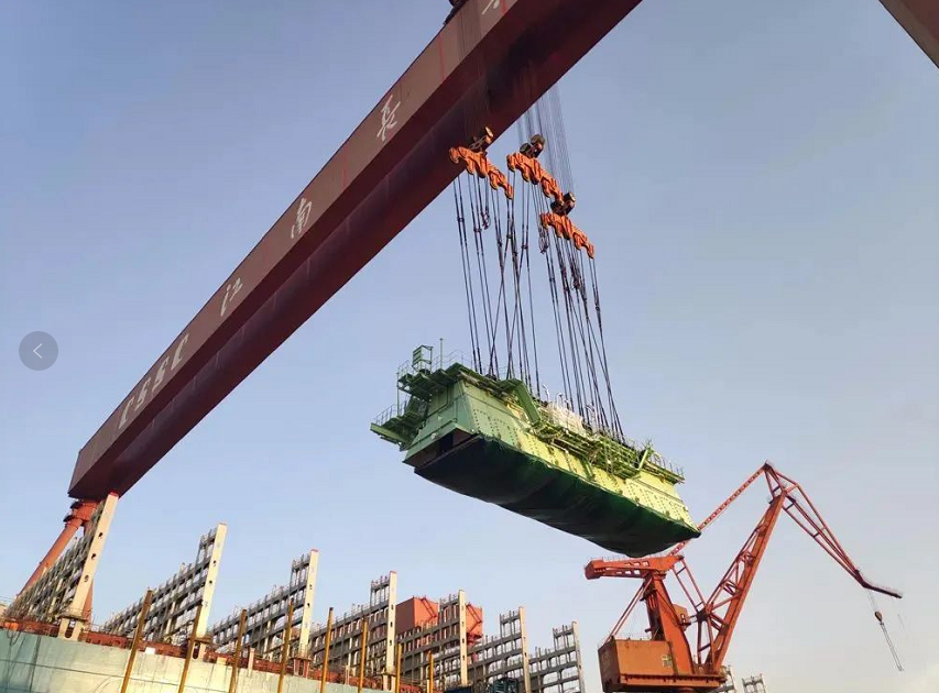????日前,中國船舶集團旗下滬東中華順利完成23000TEU集裝箱船3號船的主機吊裝工作,標志著該船向出塢邁出最關鍵一步。主機吊裝整個過程用時不到5天,同時取得僅用2.5天就完成5大件吊裝的新突破,為同行業系列船最短紀錄。