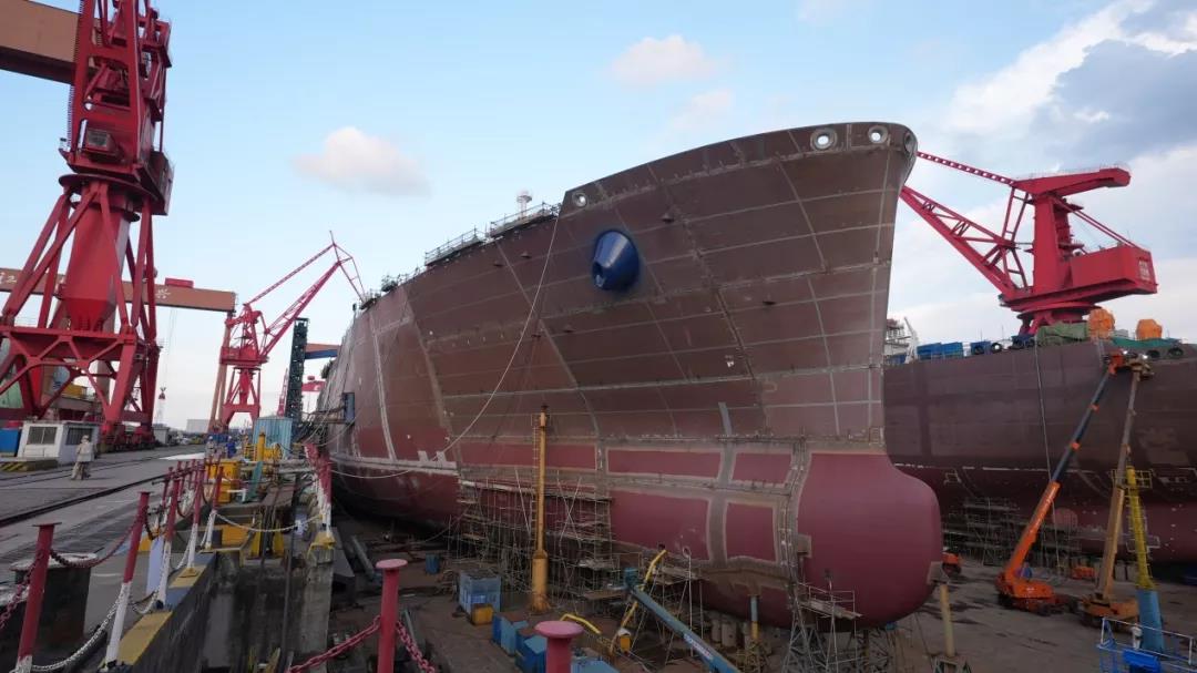 主甲板貫通:17.4萬方LNG項目首制船塢內生產有序推進