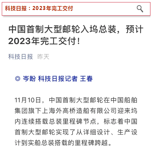 中國首制大型郵輪的入塢,標志著中國船舶集團在大型郵輪領(lǐng)域?qū)崿F(xiàn)了從詳細設(shè)計、生產(chǎn)設(shè)計,到實船總裝搭載的重大跨越,也標志著中國船舶工業(yè)在摘取“皇冠上最后一顆明珠”方面,又邁出了堅實的一大步。