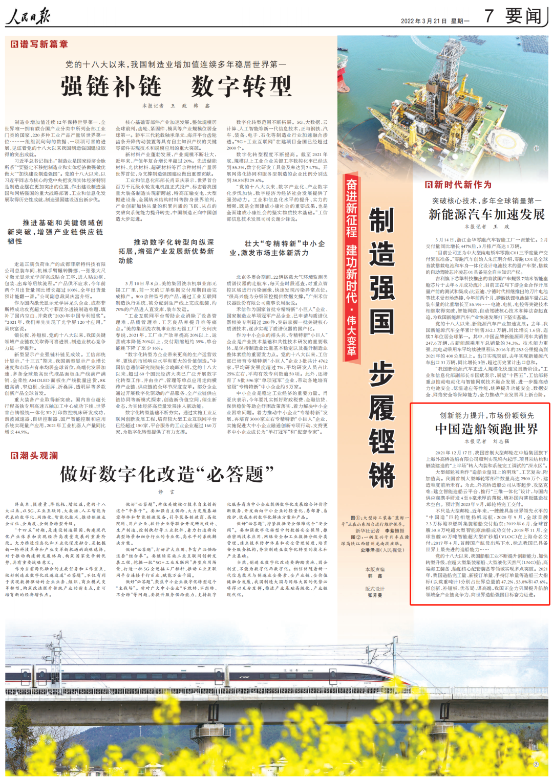 黨的十八大以來,我國船舶工業(yè)不斷提升創(chuàng)新能力、加快轉(zhuǎn)型升級,在超大型集裝箱船、大型液化天然氣(LNG)船、高端海工裝備、船舶核心配套裝備等領(lǐng)域?qū)崿F(xiàn)多點(diǎn)突破。2021年,我國造船完工量、新接訂單量、手持訂單量等造船三大指標(biāo)(以載重噸計)分別占世界總量的47.2%、53.8%和47.6%。抓創(chuàng)新、補(bǔ)短板、優(yōu)布局、謀高端,我國正全力鞏固提升船舶領(lǐng)域全產(chǎn)業(yè)鏈競爭力,向世界造船強(qiáng)國目標(biāo)奮力邁進(jìn)。