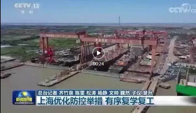 新聞聯播聚焦上海優化防控舉措,加快推動復工復產,點贊中國船舶集團旗下三大船企都實現復工復產。 | 來 源:集團公司黨群工作部 | 責 編:寧湘舒 | 校 對:王 琦 | 審 核:項 麗/甘豐錄