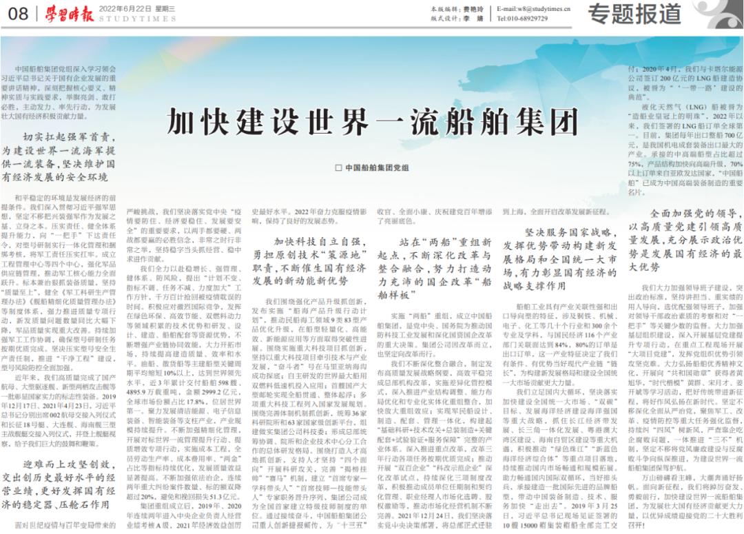 6月22日,《學(xué)習(xí)時報》發(fā)表中國船舶集團黨組署名文章《加快建設(shè)世界一流船舶集團》,萬山磅礴看主峰,大潮奔涌好揚帆,面向新征程,中國船舶集團將踔厲奮發(fā)、勇毅前行,為發(fā)展壯大國有經(jīng)濟貢獻更大力量,以優(yōu)異成績迎接黨的二十大勝利召開。