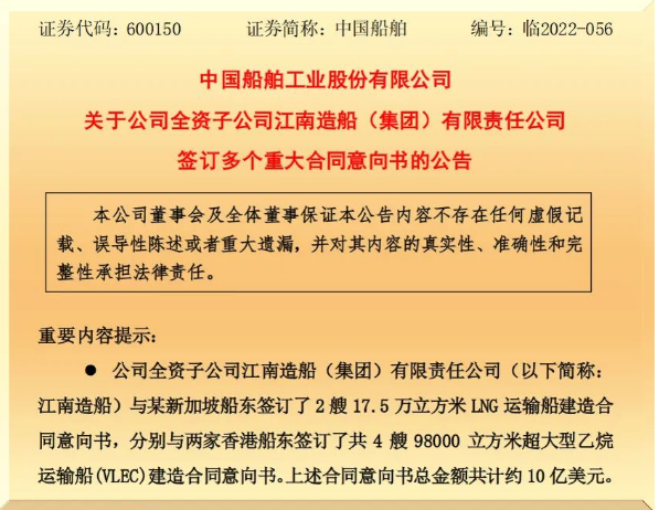10月25日,中國船舶集團有限公司旗下上市公司中國船舶工業(yè)股份有限公司發(fā)布《關于公司全資子公司江南造船(集團)有限責任公司簽訂多個重大合同意向書》的公告。根據(jù)公告,江南造船共與相關船東簽署了2型6艘約10億美元新船建造合同意向書。