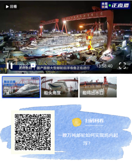 目前,船塢注水已經結束,郵輪已經起浮,將相繼實現起浮、移塢和出塢,您也可以掃描下方圖片中二維碼,一鍵直達直播現場。