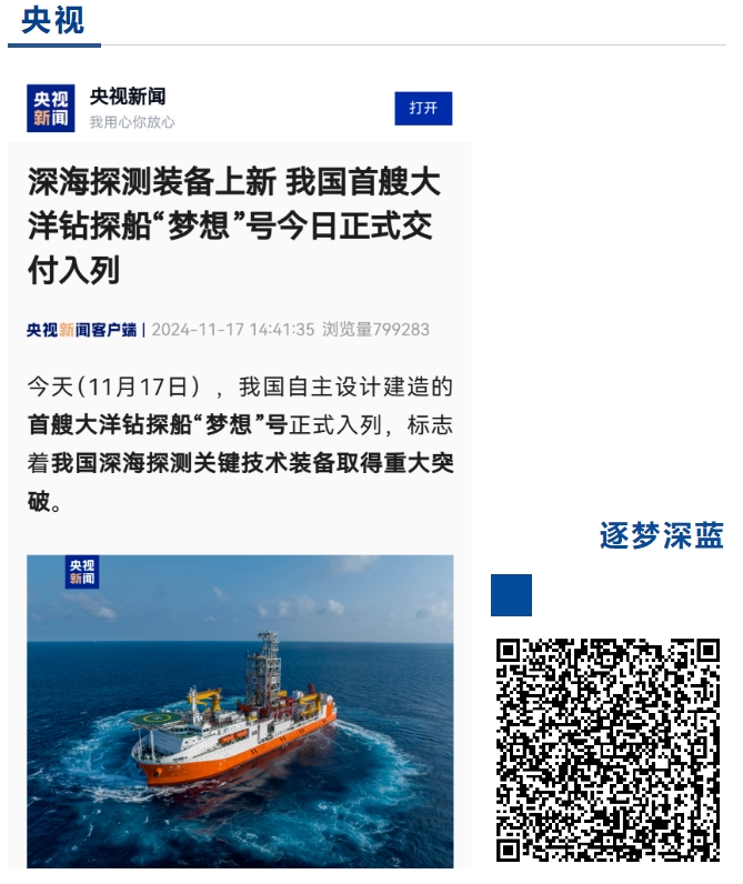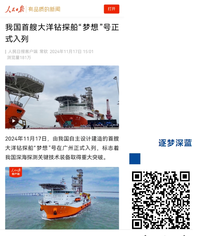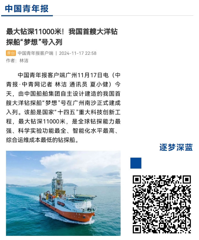 11月17日,中國船舶集團(tuán)自主設(shè)計(jì)建造的我國首艘大洋鉆探船“夢(mèng)想”號(hào)在廣州南沙交付入列,人民日?qǐng)?bào)、新華社、央視等媒體的記者來到交付現(xiàn)場(chǎng)進(jìn)行報(bào)道 。