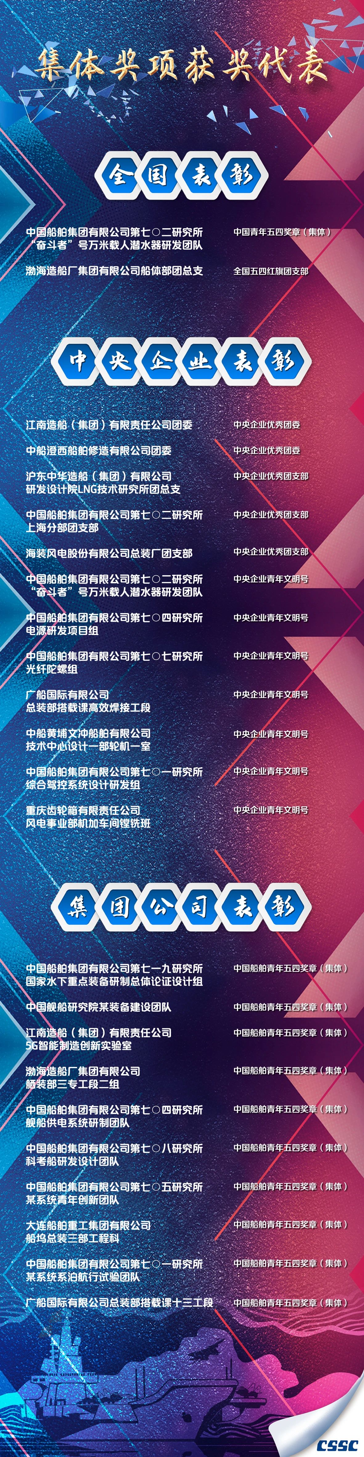 8月19日,中國(guó)船舶集團(tuán)有限公司召開(kāi)表彰會(huì)議。會(huì)上宣讀了2021年集團(tuán)公司團(tuán)員青年獲得全國(guó)和中央企業(yè)榮譽(yù)的情況通報(bào),以及集團(tuán)公司黨組頒授首屆“中國(guó)船舶青年五四獎(jiǎng)?wù)隆钡臎Q定。