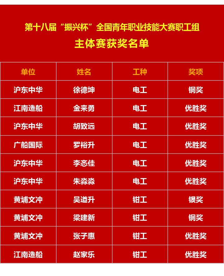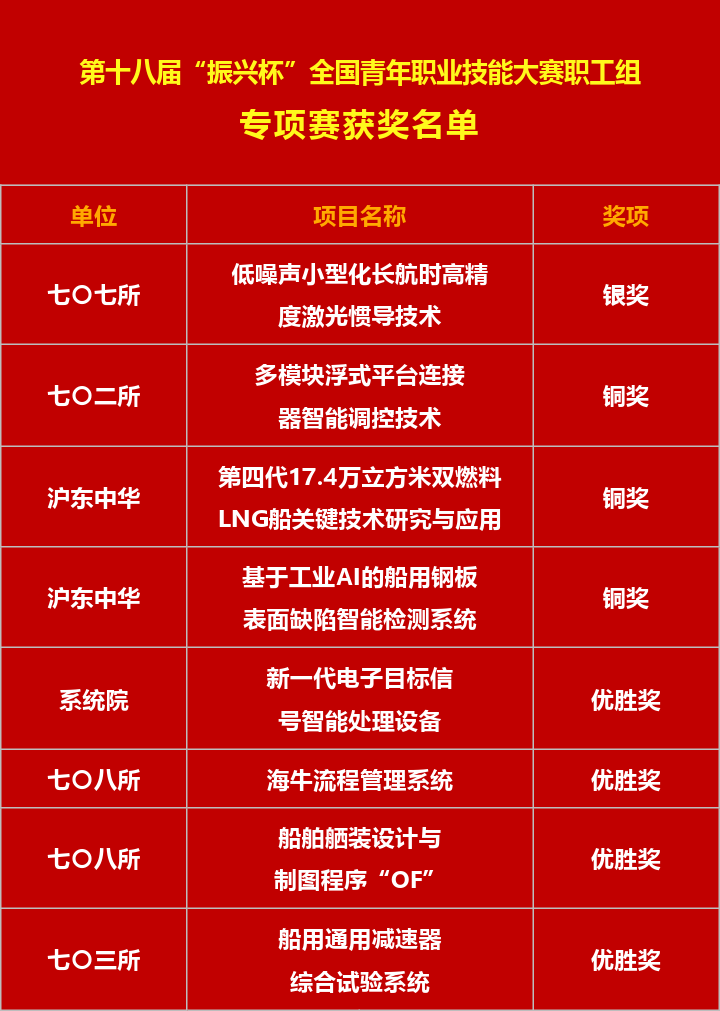 11月15日,第十八屆“振興杯”全國青年職業技能大賽職工組全國決賽在沈陽落下帷幕,中國船舶集團青年取得主體賽(職業技能競賽)“1銀2銅7優勝獎”、專項賽(創新創效競賽)“1銀3銅4優勝獎”的好成績。其中,黃埔文沖吳道升、七〇七所“低噪聲小型化長航時高精度激光慣導技術”項目分獲銀獎,在“青春競技場”上展現了船舶青年的自信卓越風采。