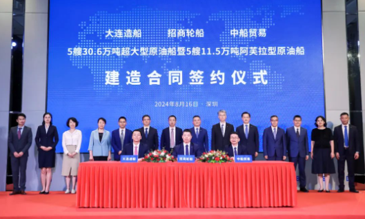 近日,中國船舶集團旗下大連造船聯(lián)合中船貿(mào)易與招商輪船簽署5艘30.6萬噸原油船、5艘11.5萬噸原油船建造合同。