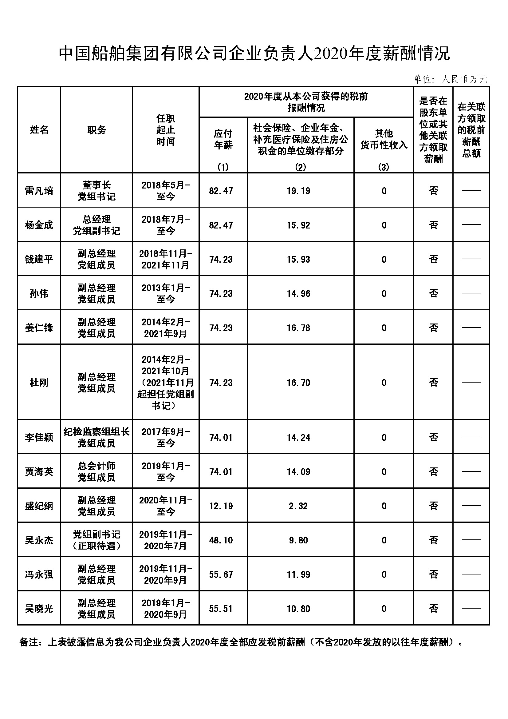 中國船舶集團有限公司企業(yè)負責(zé)人2020年度薪酬情況