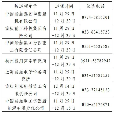 根據(jù)中國船舶集團(tuán)黨組2023年第二輪巡視工作部署,截至2023年11月29日,巡視工作已經(jīng)鋪開。其中,對中國船舶集團(tuán)華南船機(jī)有限公司、重慶前衛(wèi)科技集團(tuán)有限公司、中國船舶集團(tuán)汾西重工有限責(zé)任公司、杭州應(yīng)用聲學(xué)研究所、上海船舶電子設(shè)備研究所等5家單位開展常規(guī)巡視,對重慶川東船舶重工有限責(zé)任公司、中國船舶重工集團(tuán)新能源有限責(zé)任公司等2家單位開展專項巡視。