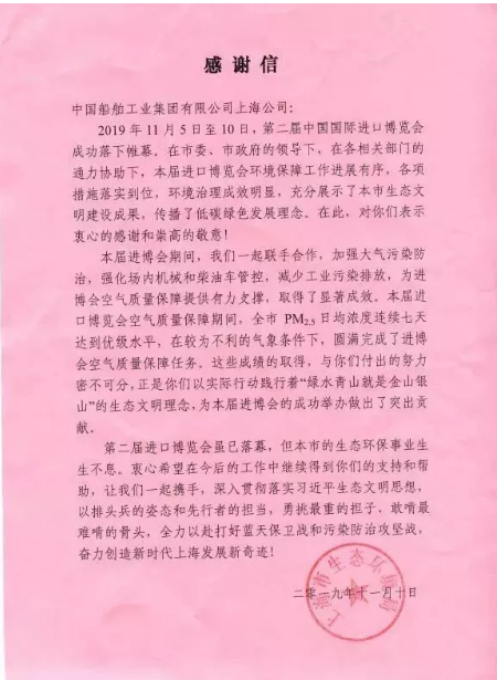 ????近日,中國(guó)船舶集團(tuán)有限公司所屬中船上海船舶工業(yè)有限公司收到了一封來(lái)自上海市生態(tài)環(huán)境局的感謝信! 對(duì)中船上海地區(qū)企業(yè)在第二屆中國(guó)國(guó)際進(jìn)口博覽會(huì)期間的環(huán)保管控和減排工作進(jìn)行了充分肯定。